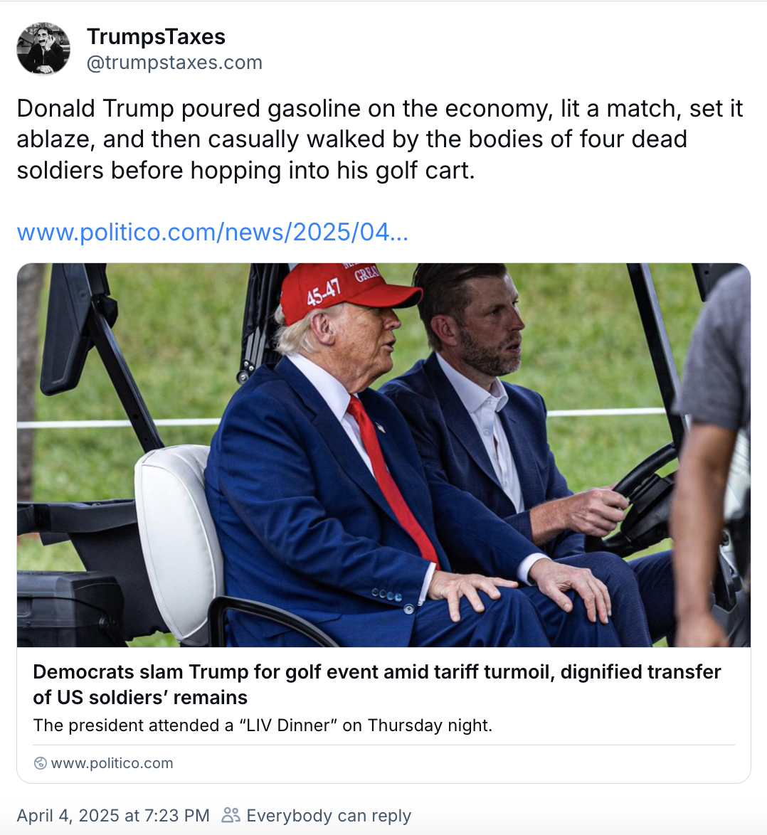 As the Trump Taxes account on Bluesky put it: Donald Trump poured gasoline on the economy, lit a match, set it ablaze, and then casually walked by the bodies of four dead soldiers before hopping into his golf cart.