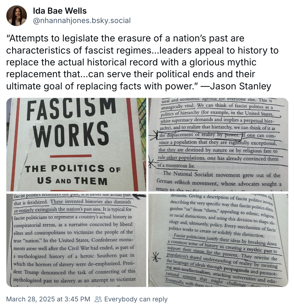 On 28 March 2025, Nikole Hannah-Jones, creator of the 1619 Project, quoted Jason Stanley, author of How Fascism Works, on Bluesky: