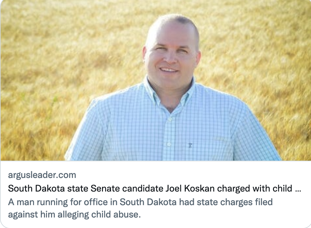 Number 873 on Cajsa's list is failed South Dakota GOP Senate candidate Joel Koskan. By the time he was arrested in 2022 for grooming and raping a family member over multiple years, the rot in the GOP was so deep that not only did his party fail to denounce him—they paid his bail. Koskan originally took a plea deal to escape prison time but the judge was so appalled by his crimes he threw that deal out. Koskan was sentenced to 10 years on two counts of incest in 2023.