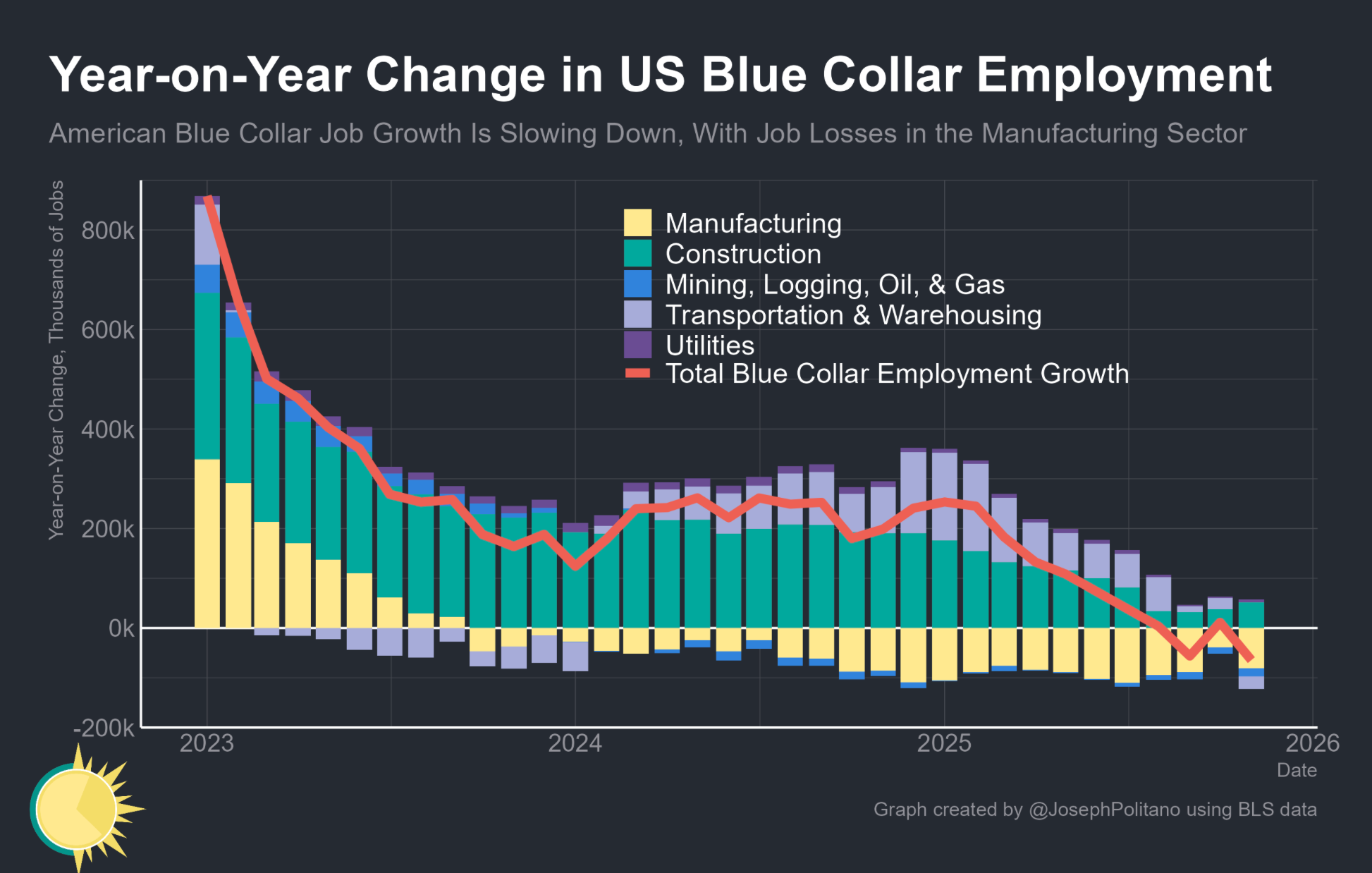 The US is losing blue-collar jobs for the first time since the pandemic—year-on-year job losses have hit 65k as manufacturing, transportation, & mining industries lose jobs at a rapid pace while growth in construction has nearly zeroed out