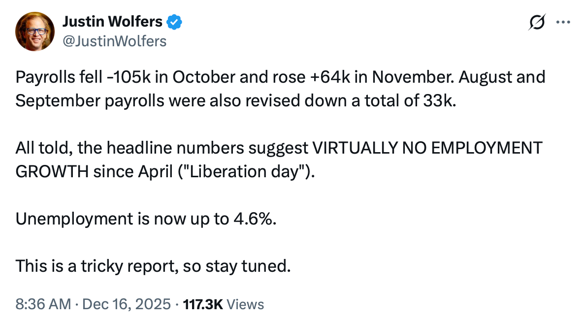 Professor Justin Wolfers tweeted: "All told, the headline numbers suggest VIRTUALLY NO EMPLOYMENT GROWTH since April ('Liberation day')."