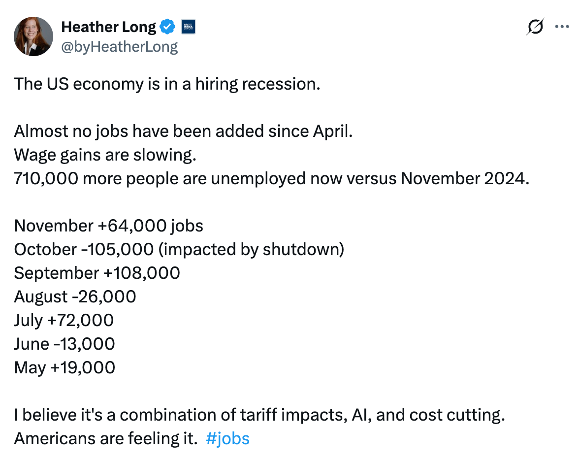 As economist Heather Long noted: "Almost no jobs have been added since April.... I believe it's a combination of tariff impacts, AI, and cost cutting. Americans are feeling it."