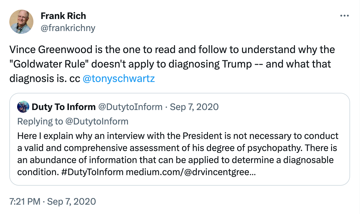 For nine years, the media and the nation's psychiatric organizations—hiding behind the antiquated "Goldwater Rule"—have failed to adequately convey the danger represented by a man with Trump's hardwired mental disorder.