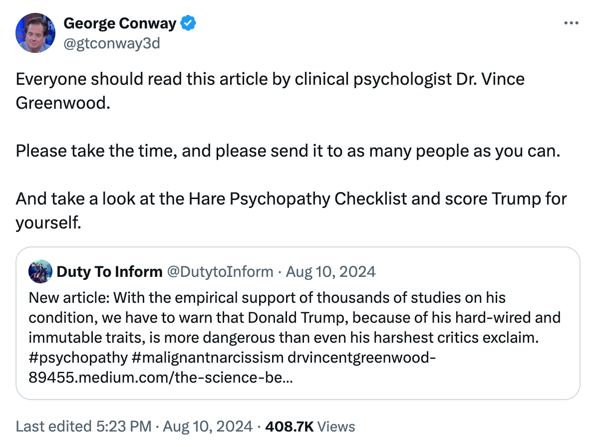 The reason I have interviewed Dr. Greenwood so many times is because I, along with many others, including Frank Rich, George Conway, and Trump ghostwriter Tony Schwartz, believe that Greenwood is correct when he says that all of Trump's most noxious behaviors can be explained by the diagnosis of Psychopathic Personality Disorder.