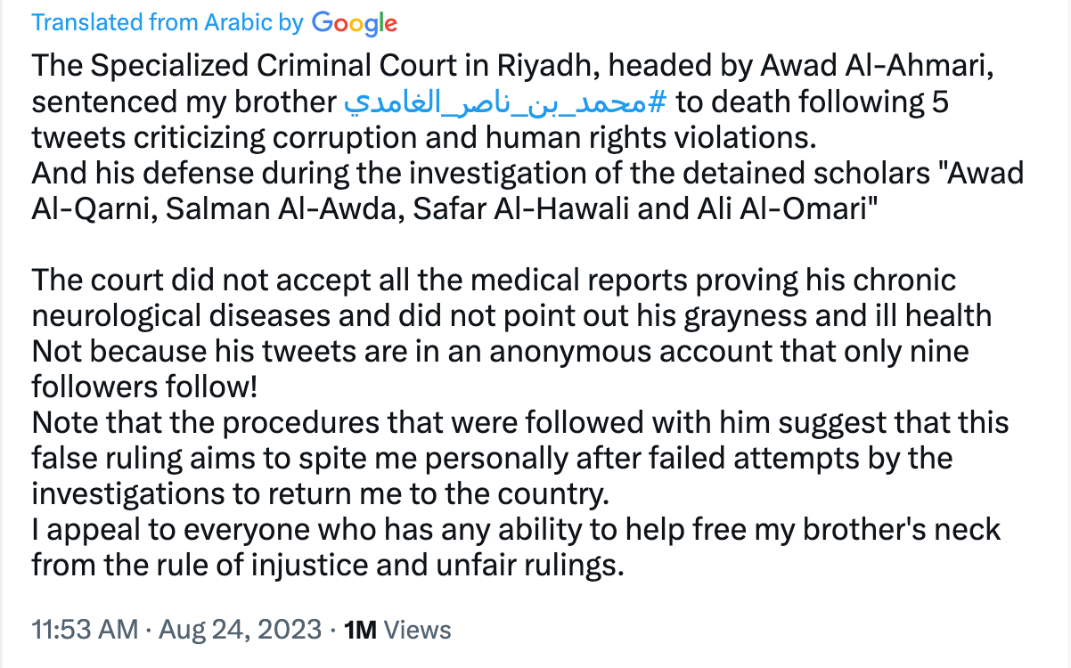 In July 2023, Mohammed al-Ghamdi, a Saudi Arabian Twitter user who had criticized the Kingdom's corruption and human rights violations via an anonymous account with only 9 followers was sentenced to death.