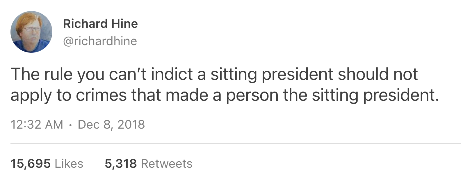 As I tweeted at the time: "The rule you can't indict a sitting president, should not apply to crimes that made a person a sitting president."