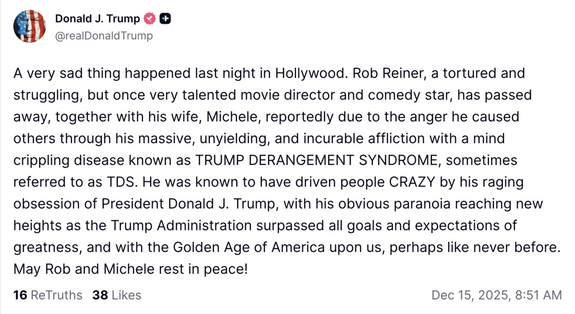 While others on social media were calling the murder of Rob Reiner and his wife Michele Singer Reiner "horrific" and "tragic," Trump was taking to social media to blame the victim for his own death, saying that Reiner's death was caused by "TRUMP DERANGEMENT SYNDROME."