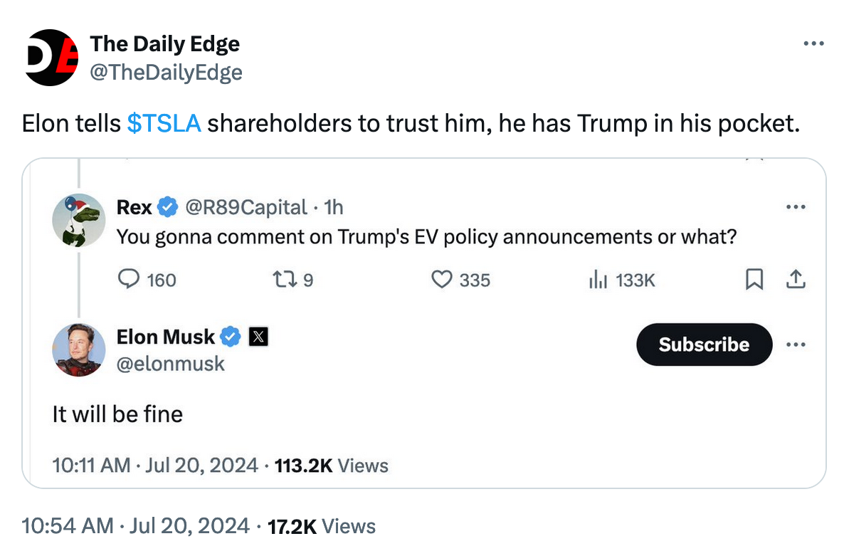 On X, Elon is telling people not to worry about Trump's threats, on the assumption that: a) Trump will say whatever he needs to say to get elected; and b) Elon already has Trump in his pocket.