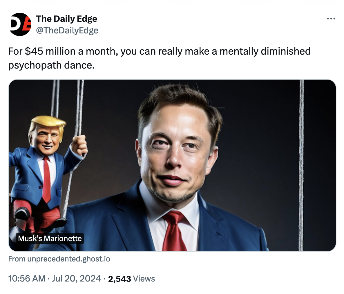 Yesterday morning, I tweeted a link to my recent "Musk's Marionette" article with the caption: "For $45 million a month, you can really make a mentally diminished psychopath dance."