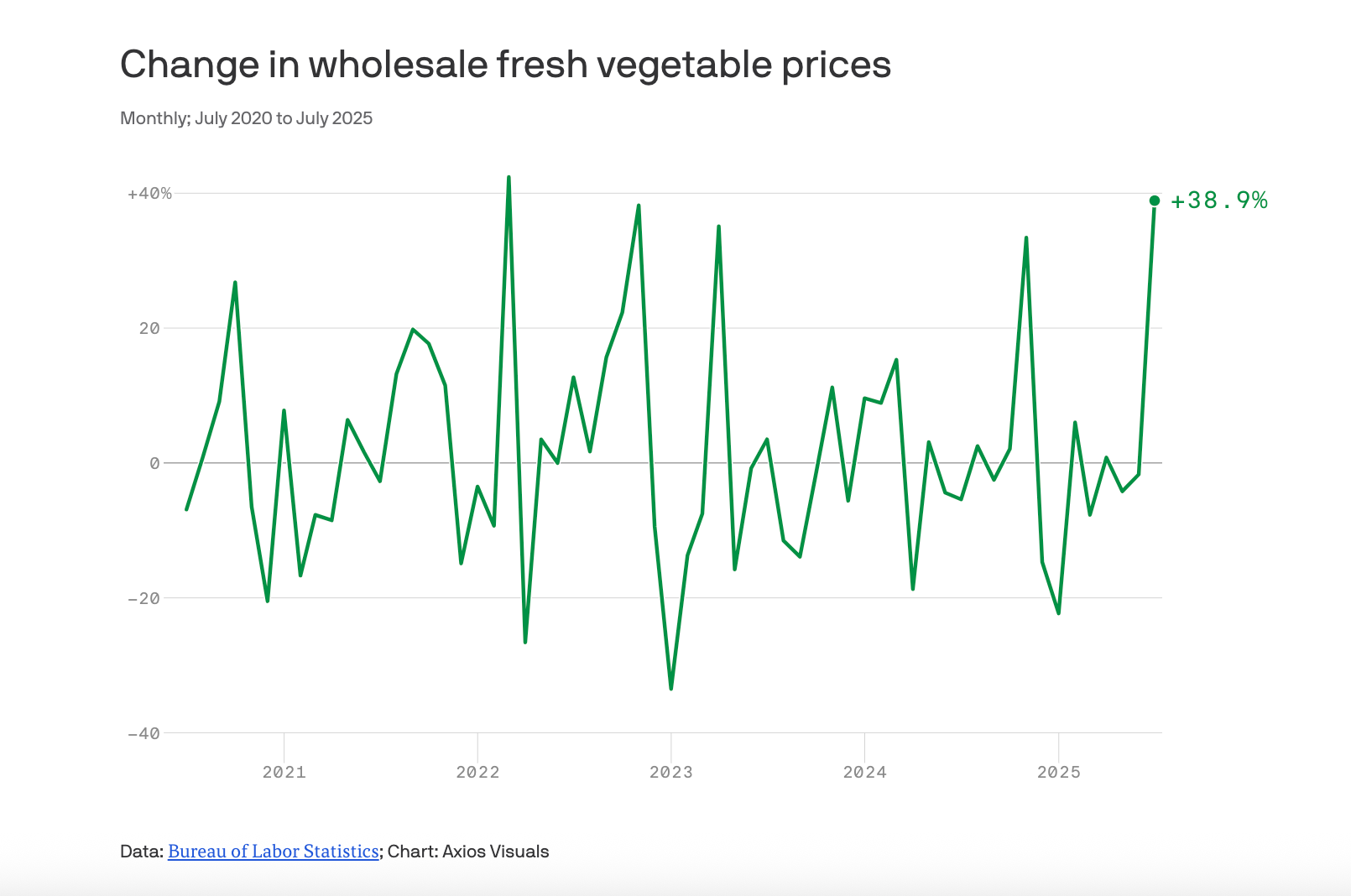 One of the biggest warning signs for consumers in today's PPI report was the 38.9% increase in prices for fresh and dry vegetables from June to July which, reports Axios, "was the biggest month-on-month increase for fresh vegetables since March 2022."