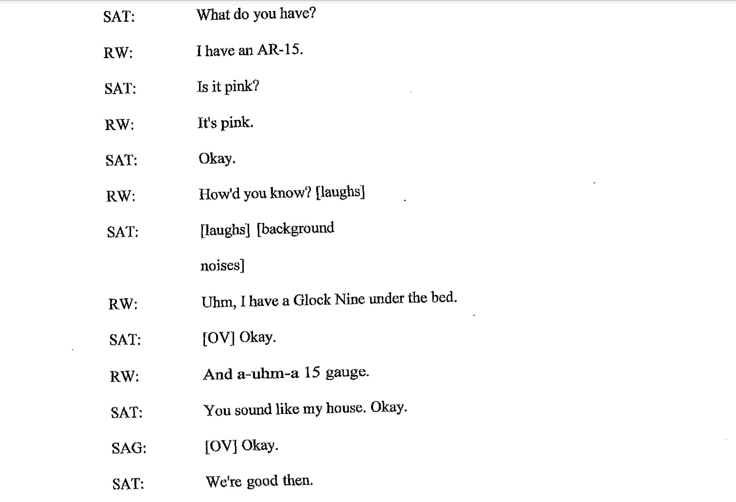 The transcript of her FBI interrogation also reveals just how into guns she was—readily telling agents she had a (pink) AR-15, a Glock Nine, and “a-uhm-a 15 gauge” in her house.