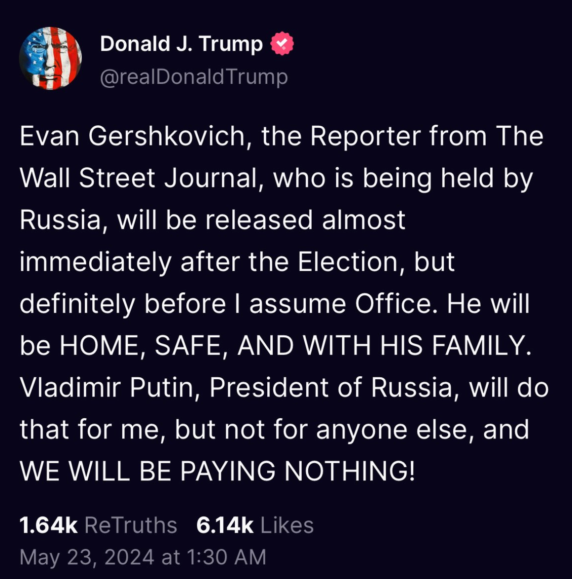 "Evan Gershkovich, the Reporter from The Wall Street Journal, who is being held by Russia, will be released almost immediately after the Election, but definitely before I assume Office. He will be HOME, SAFE, AND WITH HIS FAMILY," Trump said."Vladimir Putin, President of Russia, will do that for me, but not for anyone else, and WE WILL BE PAYING NOTHING!"