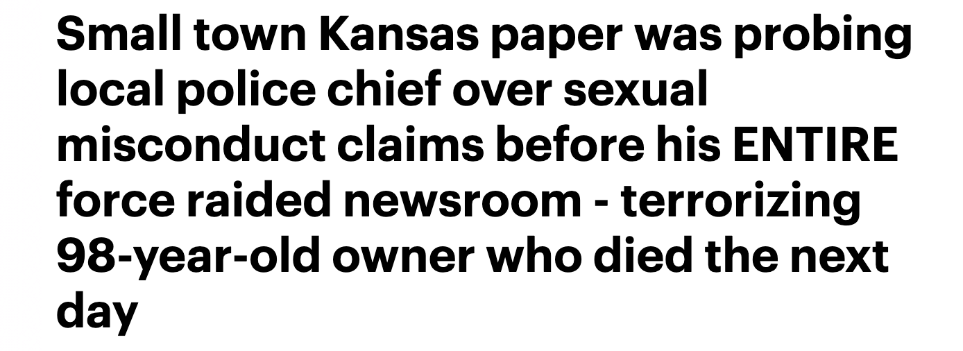 On August 11, law enforcement conducted a "Gestapo-style raid" on the offices of The Marion County Record in Kansas and two homes of people connected to the paper—including the home shared by 98-year-old Joan Meyer (a co-owner of the paper) and her son Eric Meyer (the publisher of the paper).