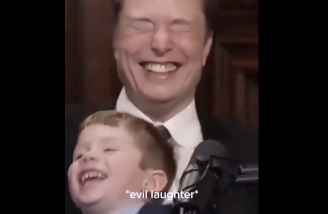 Then, the child and his father share several seconds of what one internet captioner has labeled evil laughter.